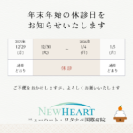 年末年始の休診日をお知らせいたします 公開日:2025年12月15日 お知らせ ニューハート・ワタナベ国際病院の年末年始の外来診療体制をお知らせいたします。 【2025年12月30日(火)~2026年1月4日(日) 休診】 なお、2025年12月29日(月)と2026年1月5日(月)は通常通りの外来 […] 続きを読む